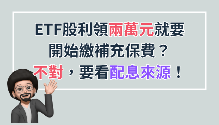 當然這只是預估,要不要繳補充保費還是以當期的公告為主,但近期高股息ETF的配息來源很高比例來自「資本利得」,如果你領取的股利剛好介於20,000左右,應該是不需要擔心補充保費的問題!